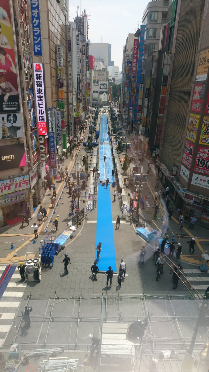 歌舞伎町ゴジラロードかジャパンプレミアにむけて準備してた。レッドカーペットではなく、ゴジラの熱線をイメージしたブルーカーペットなのね。 pic.twitter.com/HpfzF3wLj0 2019-05-27 14:54:00