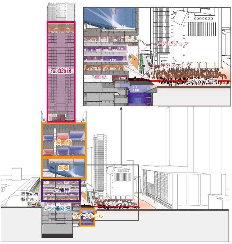 本計画は、世界有数の都市観光拠点である新宿歌舞伎町エリアに、映画館・劇場・ライブホールなどのエンターテインメント施設、ホテルなどからなる地上48階・地下5階・塔屋1階、約225mの高層複合施設(以下、「本施設」)を整備するものです。映画館は東急レクリエーションが、劇場、ライブホールなどのエンターテインメント施設は東急レクリエーション・株式会社ソニー・ミュージックエンタテインメント・東急電鉄の3社が出資する株式会社TSTエンタテイメントが、運営を行います。