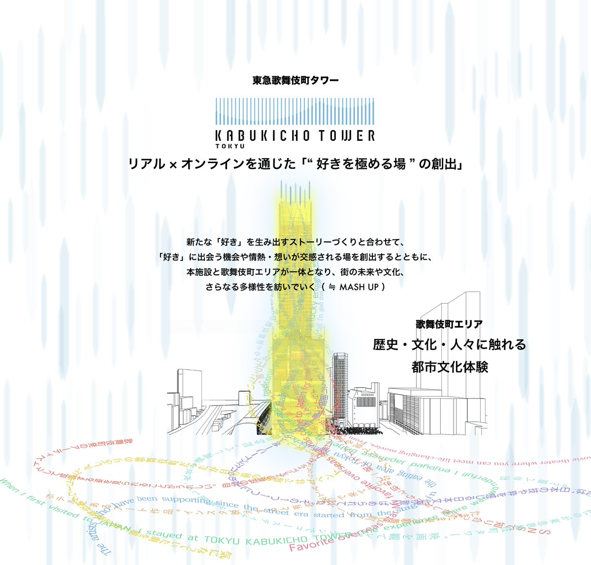 昨今の新型コロナウイルス感染症の拡大により、世界中でエンターテインメントの楽しみ方や宿泊へのニーズが大きく変化していますが、リアルな体験価値への渇望はますます高まりを見せ、好きなものへの情熱は世代を超えて広がってきています。本施設では、「“好きを極める場”の創出」をコンセプトに掲げ、ホテルとエンターテインメントの複合施設という特性を活かし、「見出す~育てる~羽ばたかせる」といった新たな「好き」を生み出すストーリーづくりに取り組みます。そして、リアルとオンラインを通じて、それらのストーリーと合わせながら、「好き」に出会う機会や、そこに集う方々の「好き」への情熱が交感される場を創出することで、極められたさまざまな「好き」の想いとともに街の未来や文化、延いてはさらなる多様性を紡いでいくこと(MASH UP)を目指します。