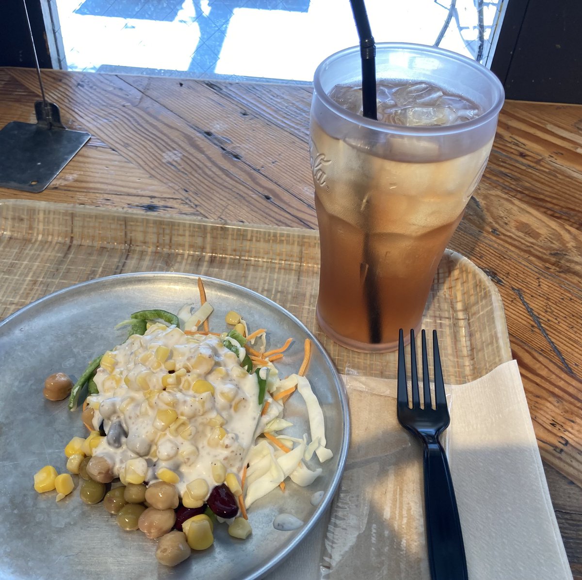 チーズバーガーにサラダバーとドリンクが付いて1110円は立地的なものを考えればコスパ良し。