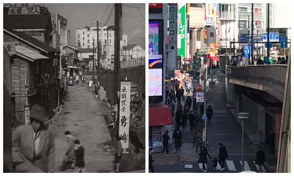 川島雄三監督『追跡者』(昭和23年/松竹)から新宿南口階段下の定点対比。左にある木造の建物は外食券食堂時代の長野屋(大正4年創業、いまも盛業中)。奥の白い建物は京王帝都ビル。 #旧景 #川島雄三 #追跡者 pic.twitter.com/oVoafzDmvZ 2018-04-10 20:05:00