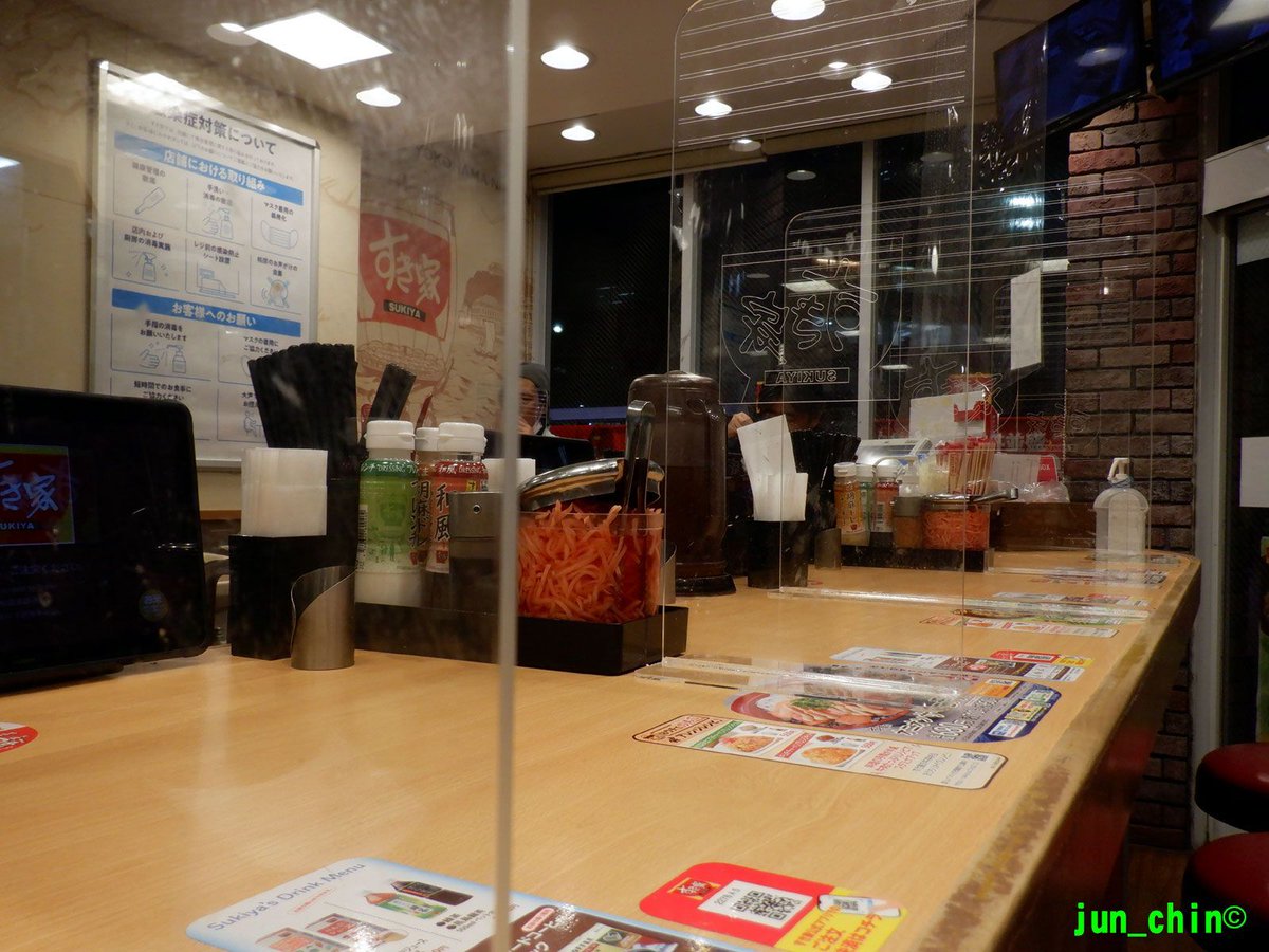 カウンタ席に間仕切り「すき家 新宿南店」