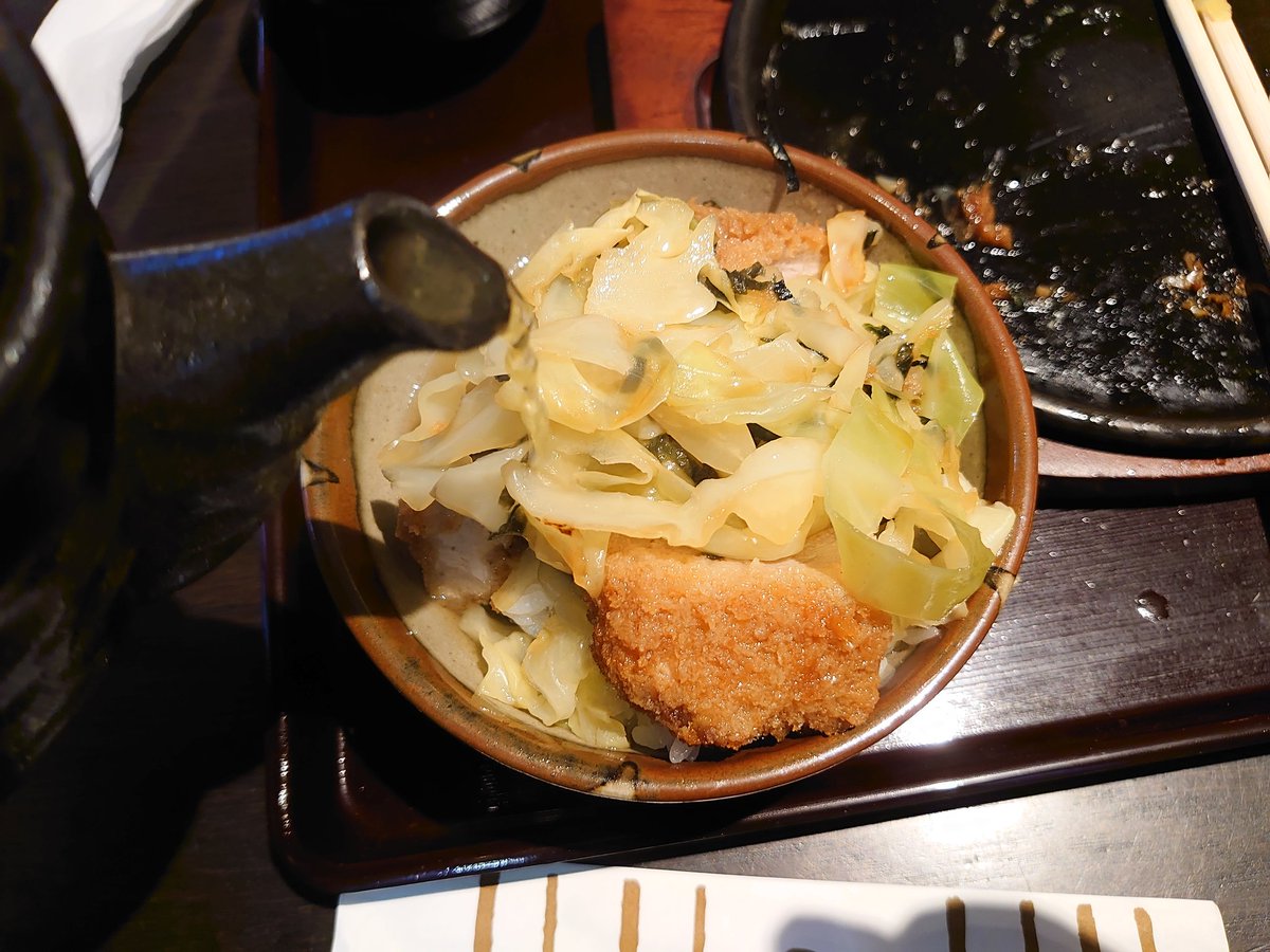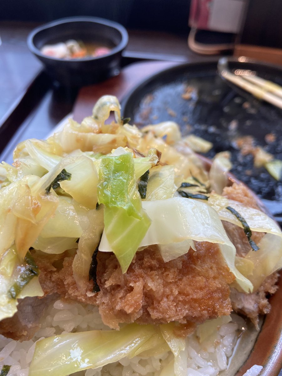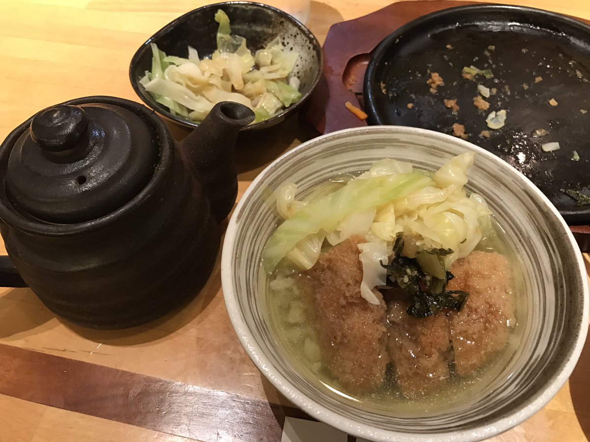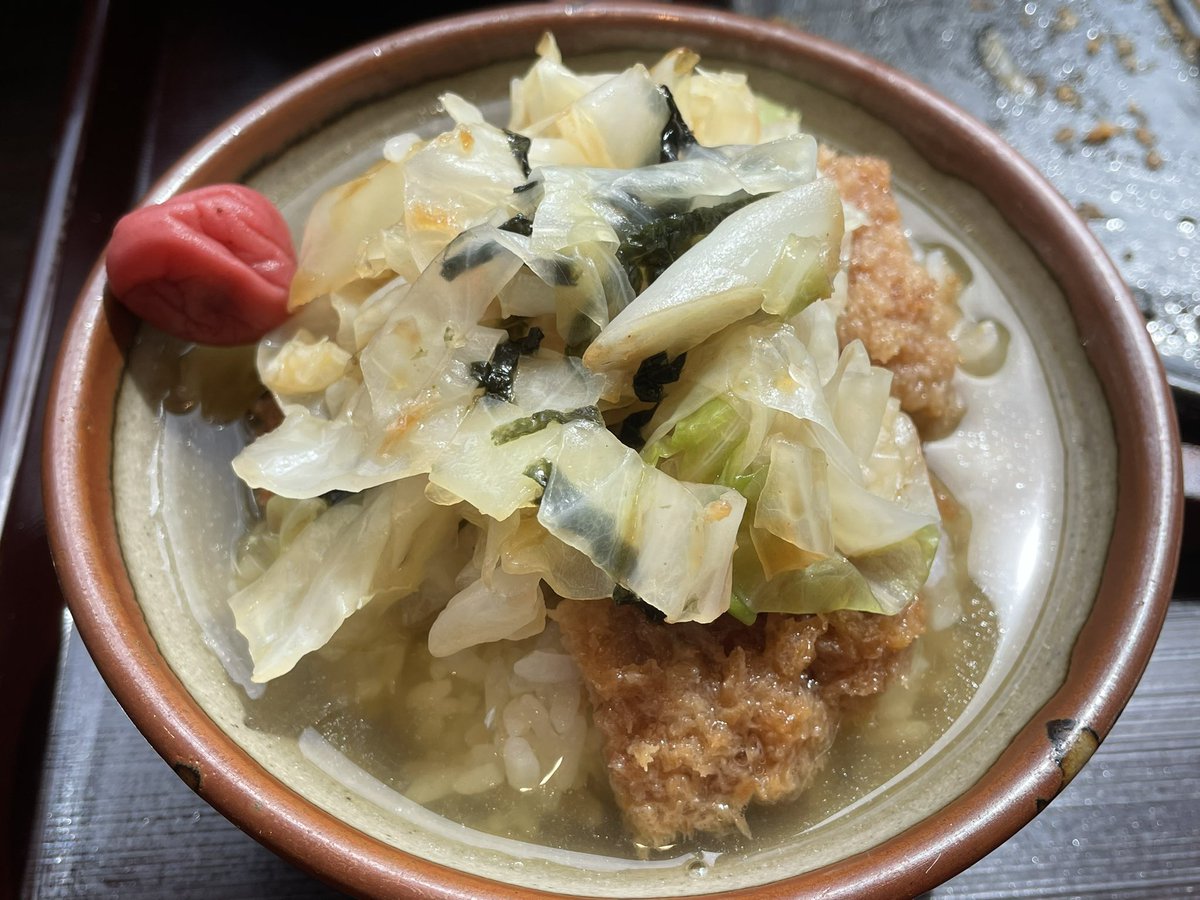 醤油味のたっぷりキャベツ、味が染み込んだとんかつ、締めの茶づけもまた美味。漬物もうまいんだよな〜。