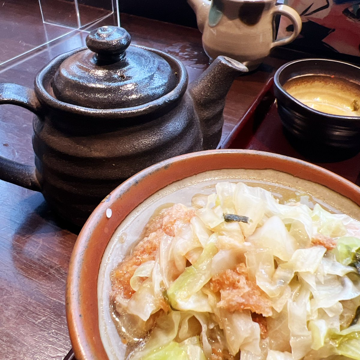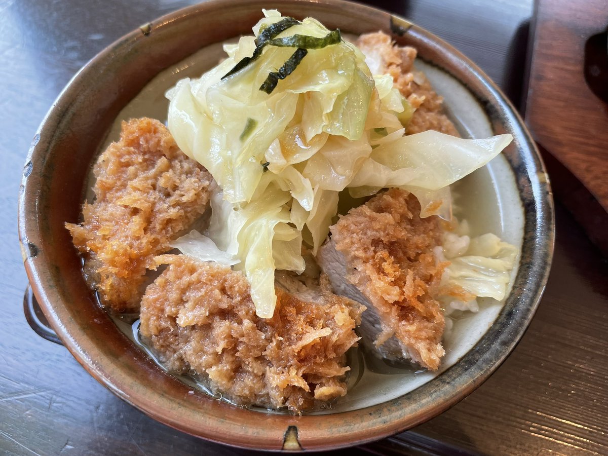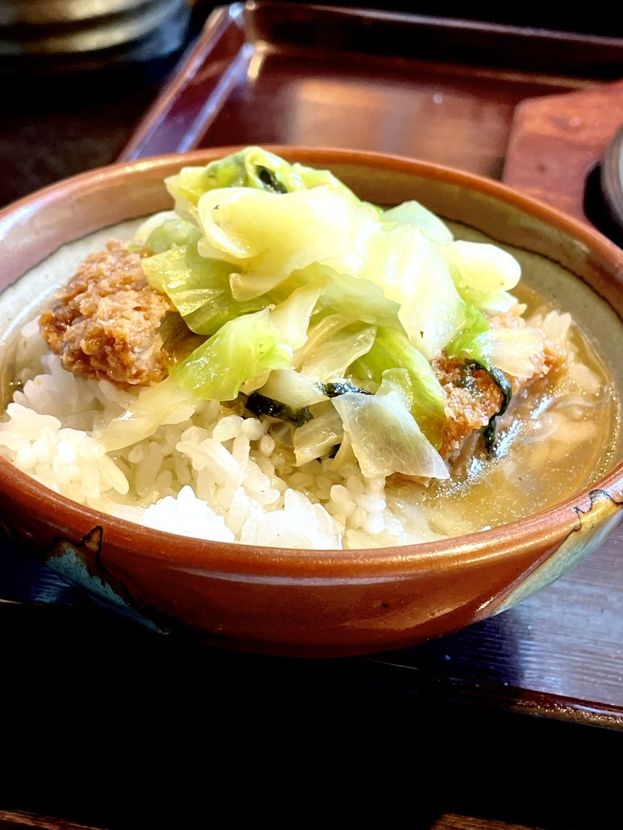 醤油味のたっぷりキャベツ、味が染み込んだとんかつ、締めの茶づけもまた美味。漬物もうまいんだよな〜。