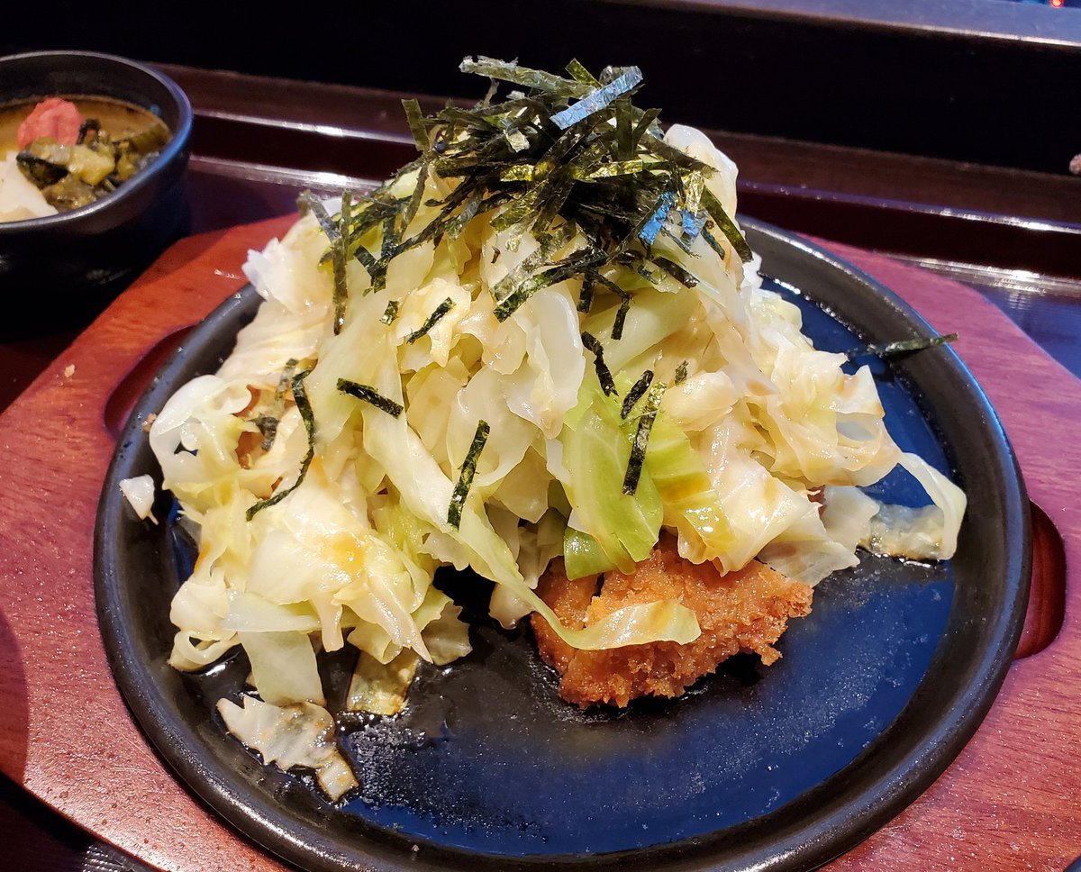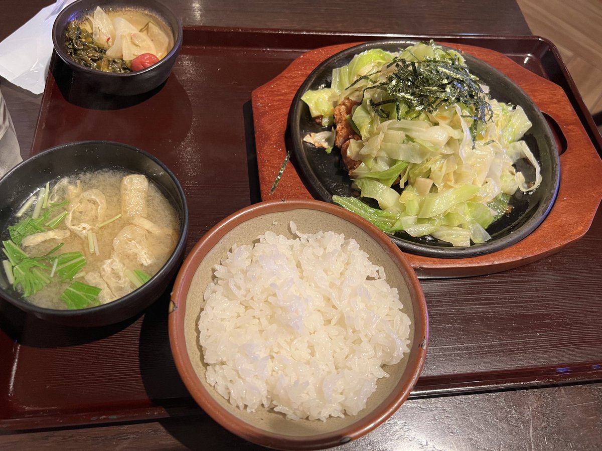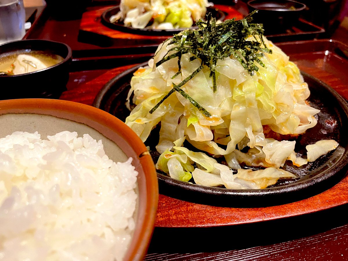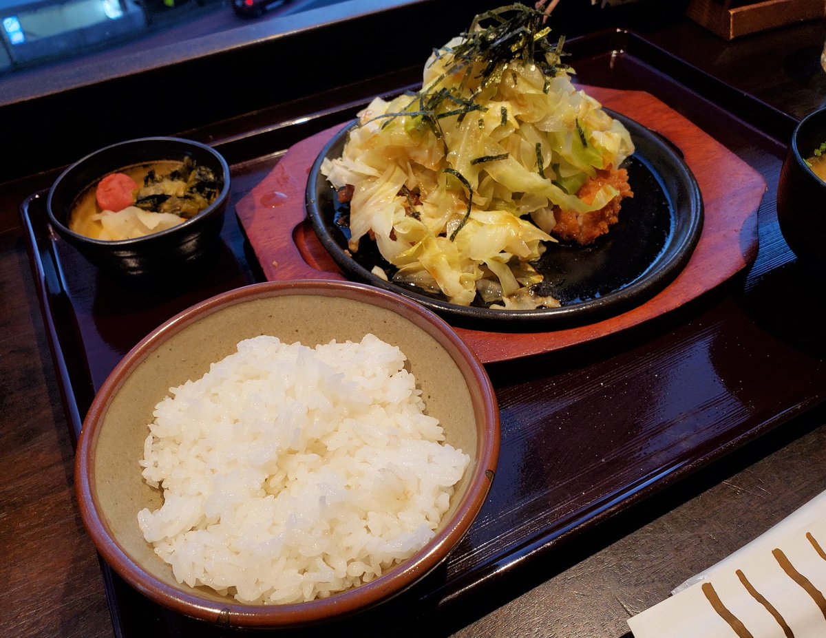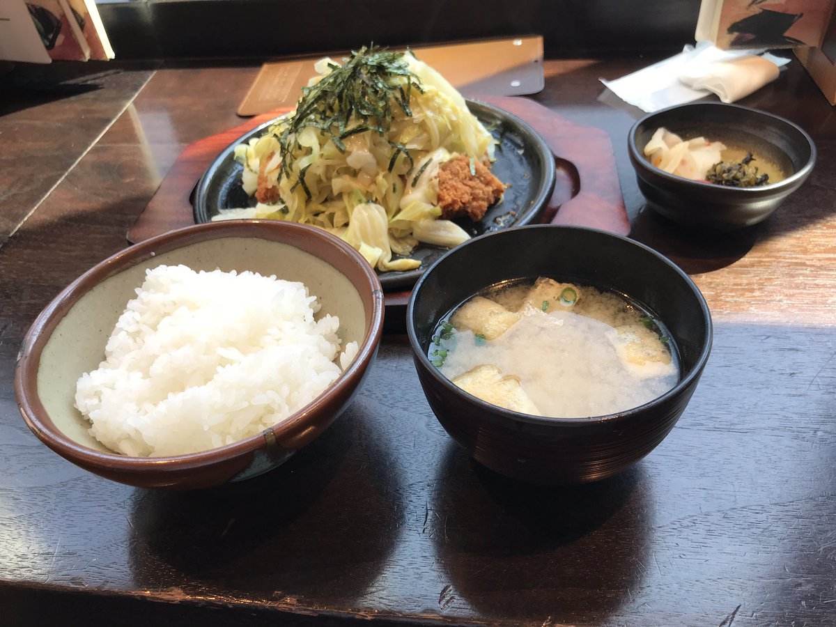 キャベツのおかわり、ご飯のおかわり、漬物のおかわり、しじみ味噌汁のおかわり無料。実質、食べ放題と言える。