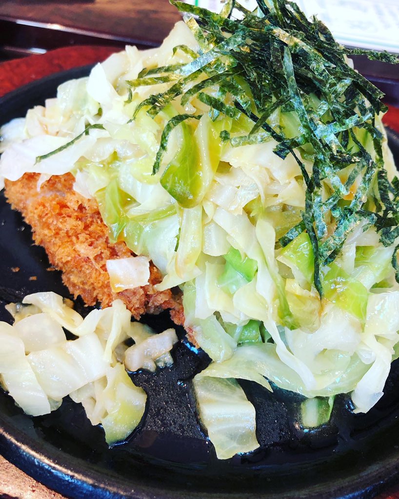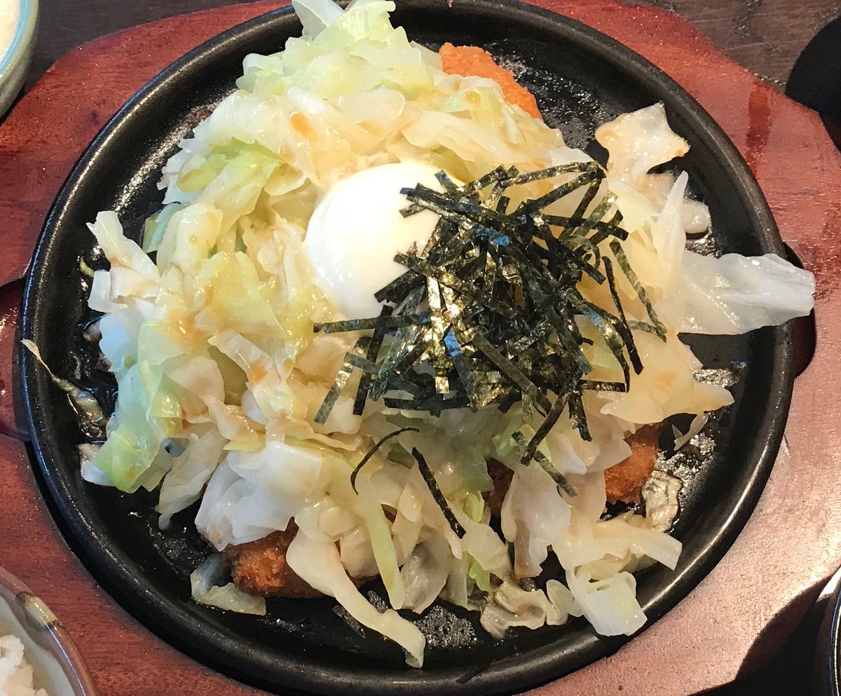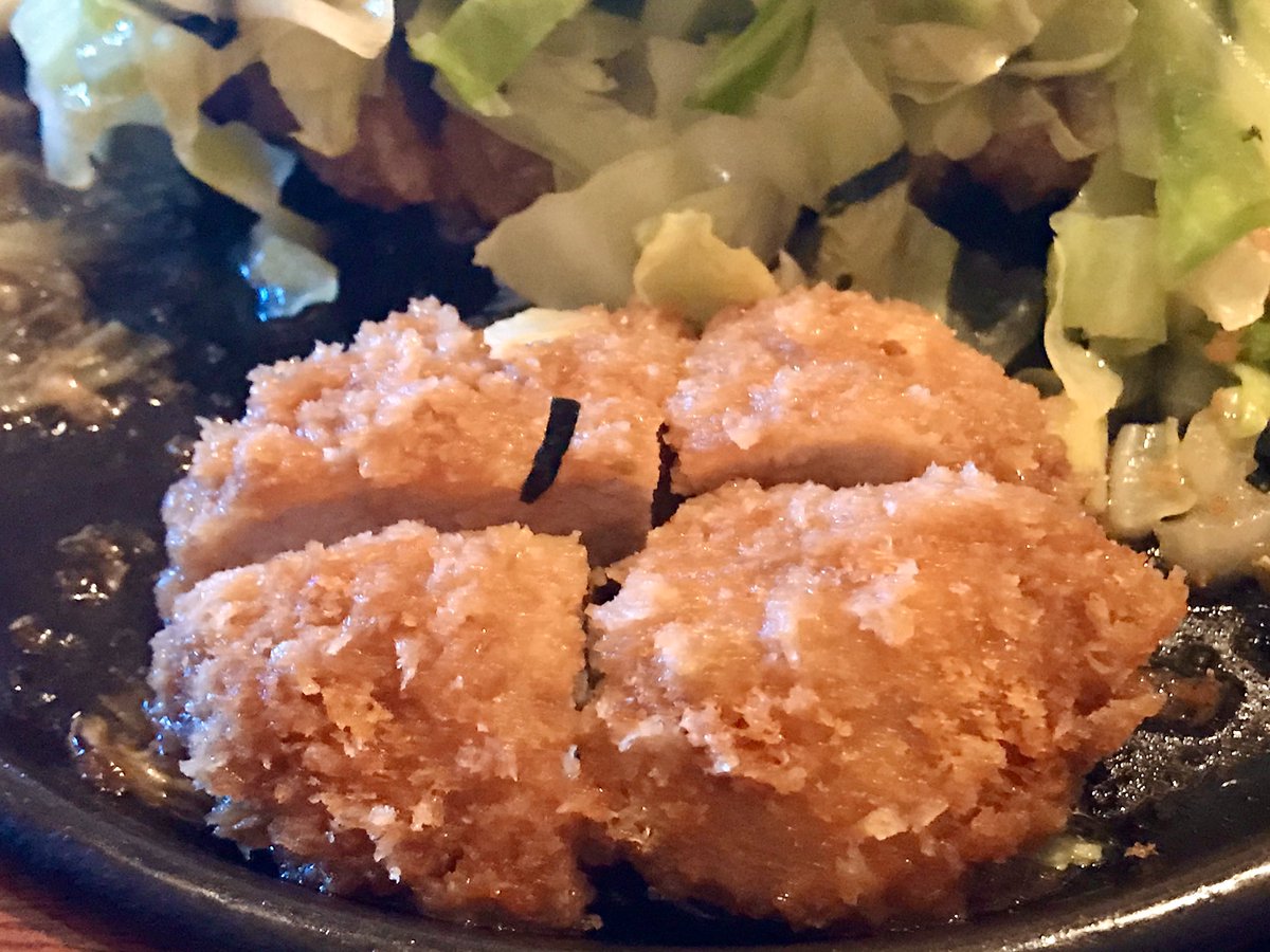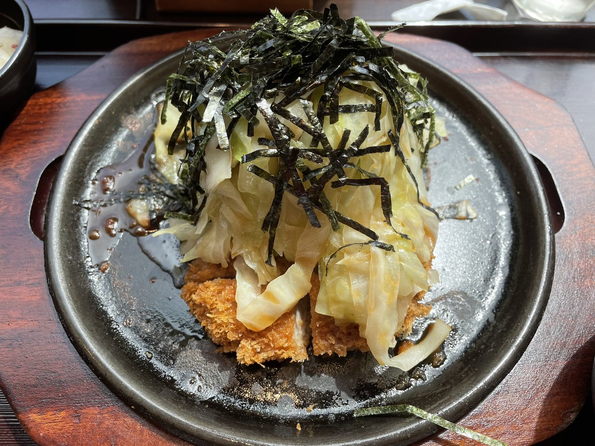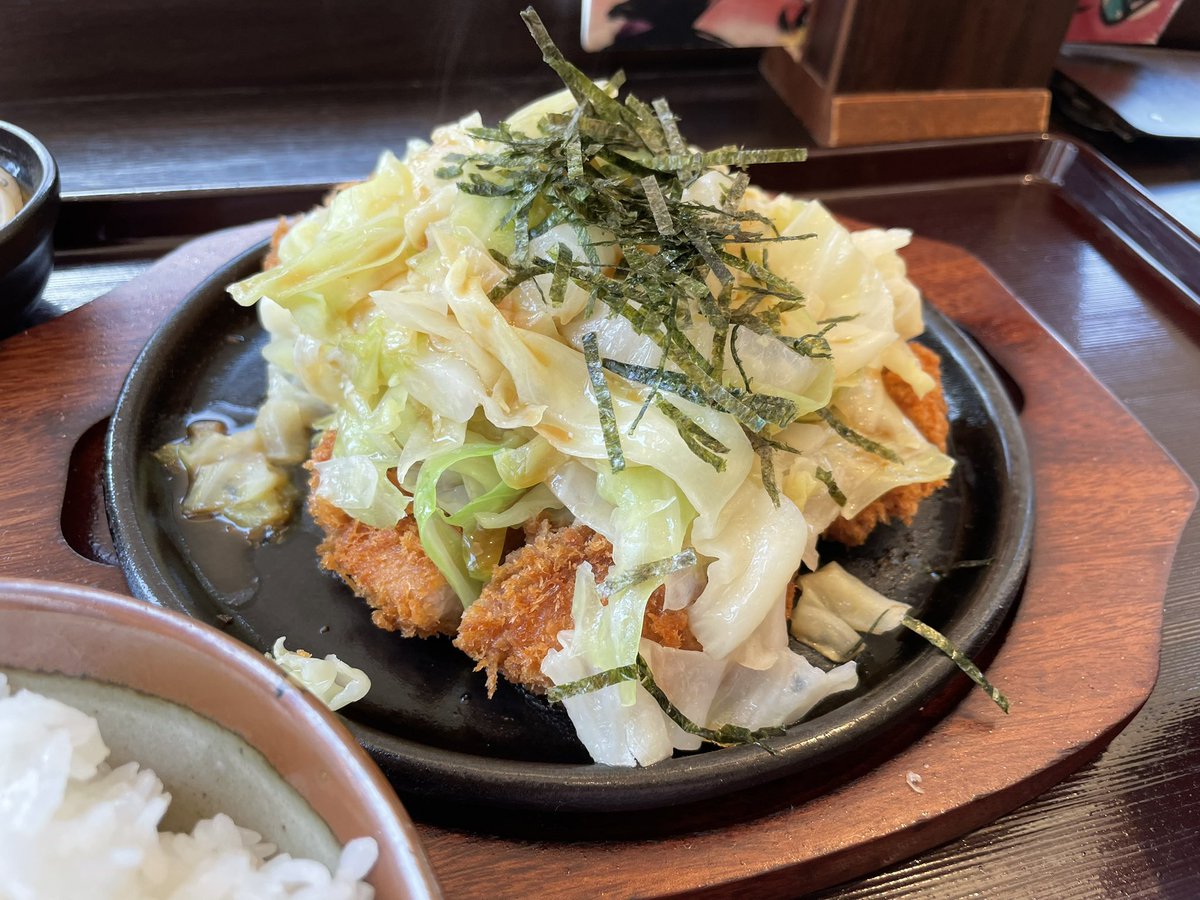 熱々の鉄板に盛られた、とんかつと炒めキャベツ。