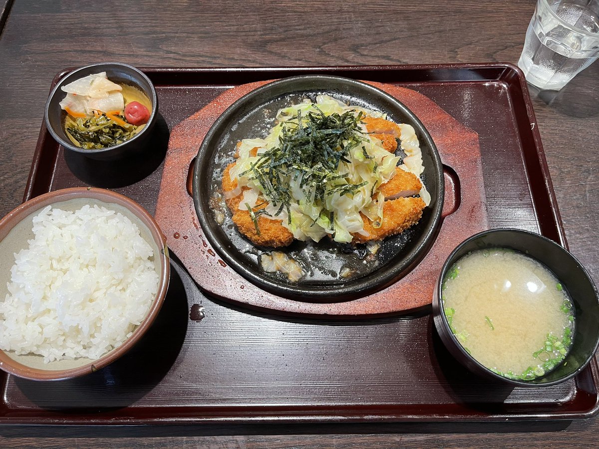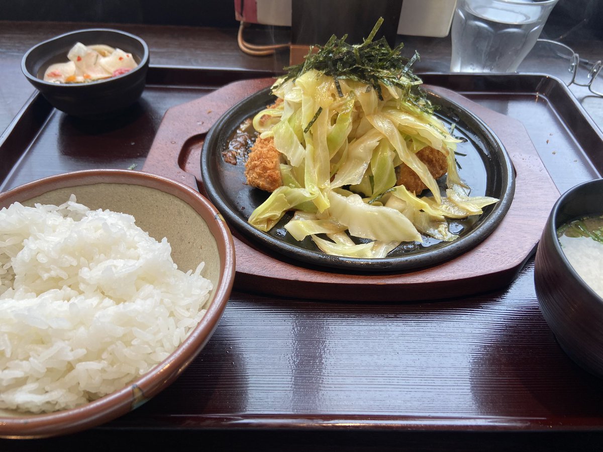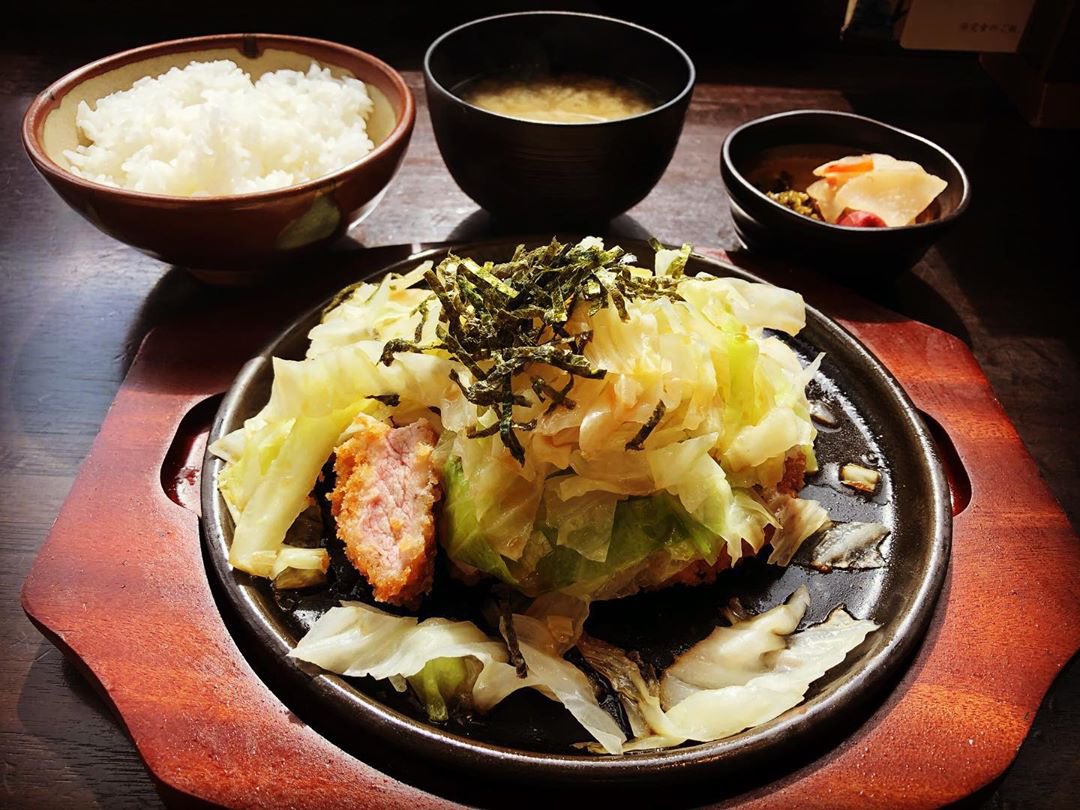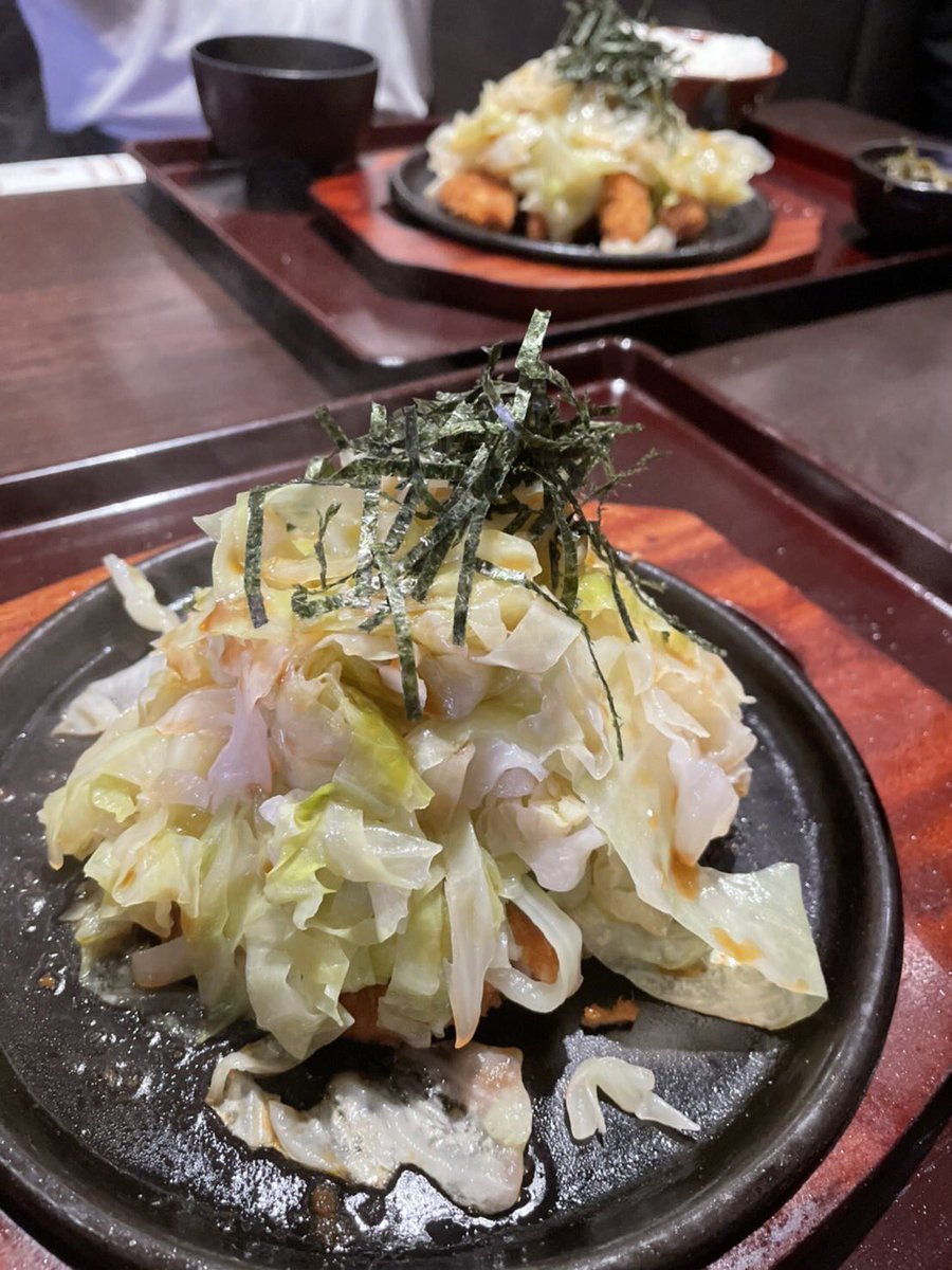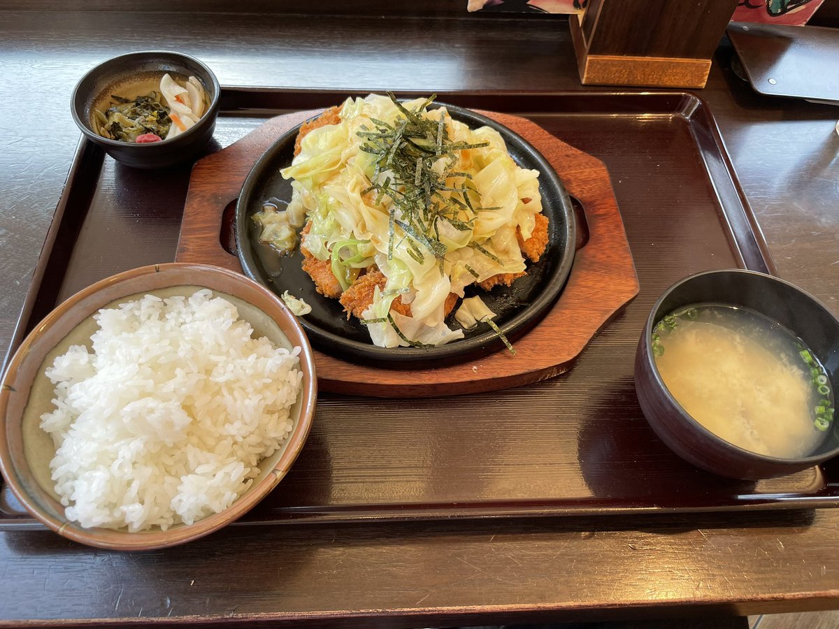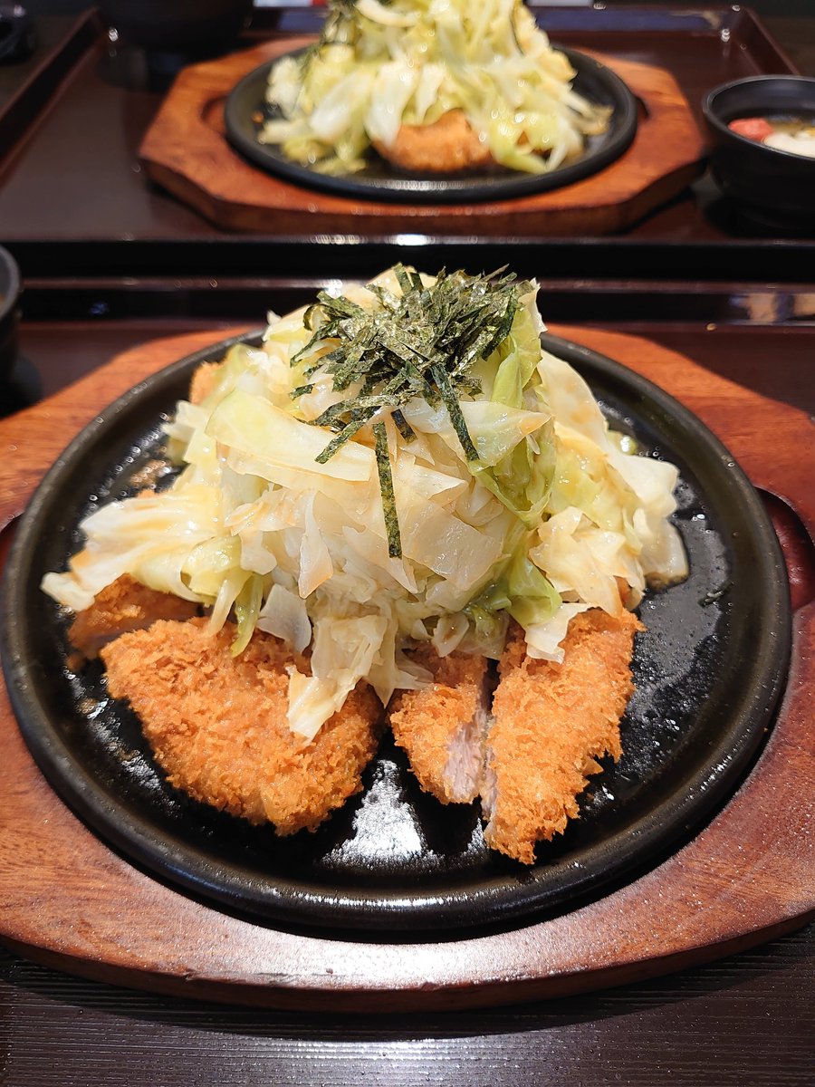 熱々の鉄板に盛られた、とんかつと炒めキャベツ。