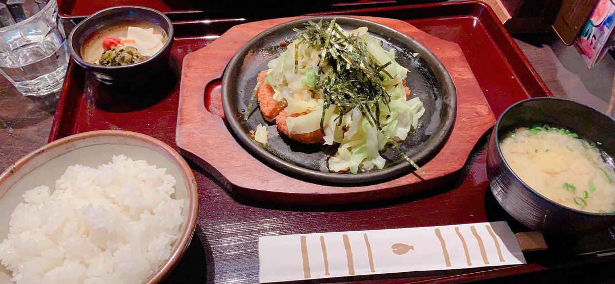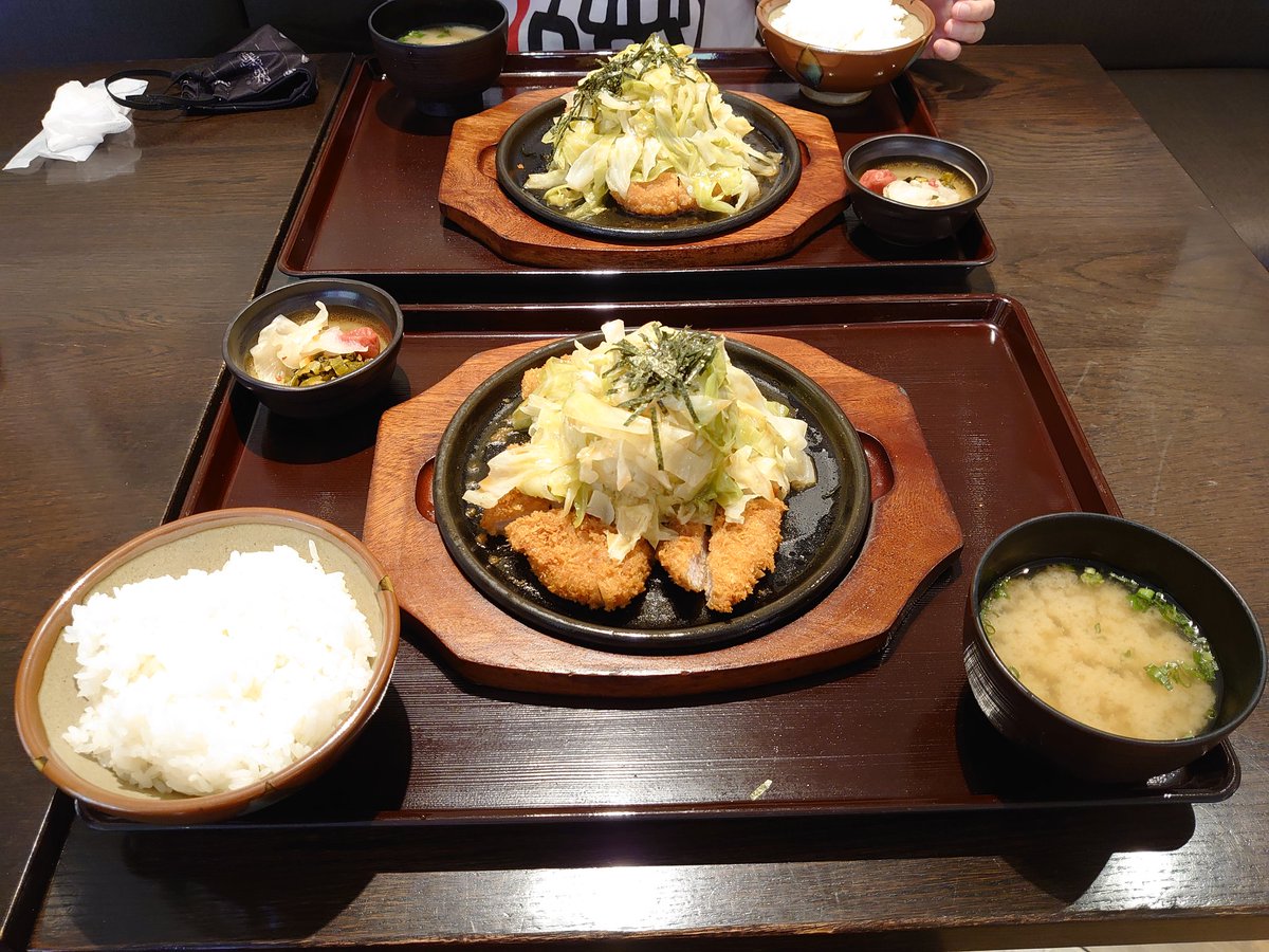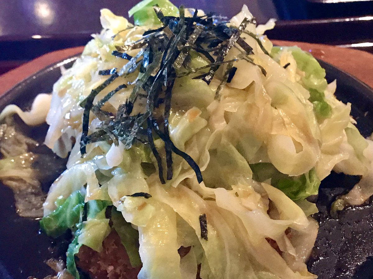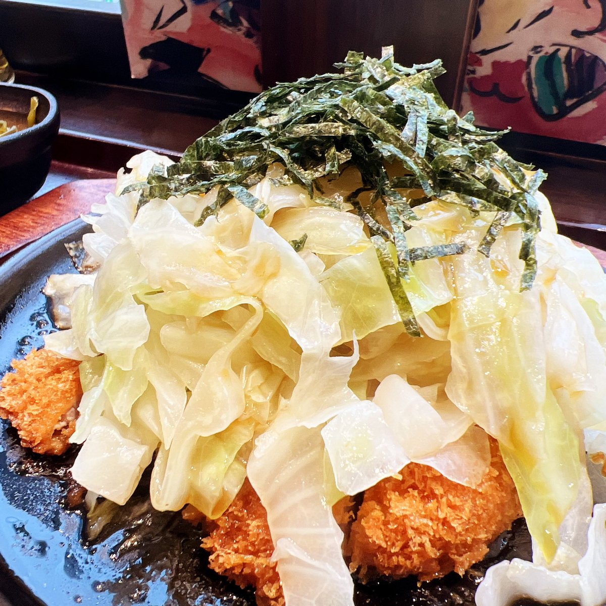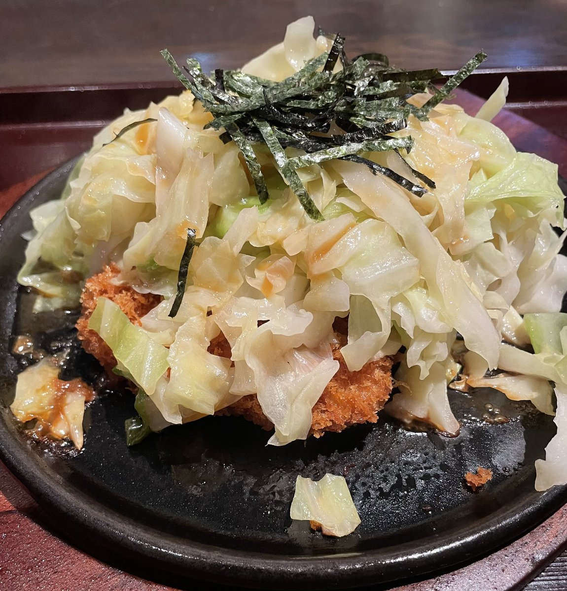 熱々の鉄板に盛られた、とんかつと炒めキャベツ。
