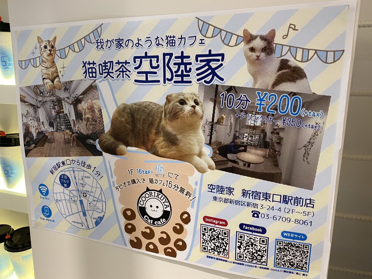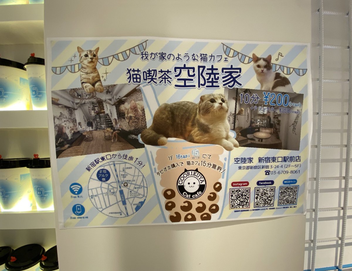 新宿の16TAPI。期間限定で全品160円で、しかもタピオカを買うと上の猫カフェが15分無料になるって凄すぎてもはや理解不能じゃないですか?? pic.twitter.com/ZeL3EvwqDL 2020-05-31 11:18:00