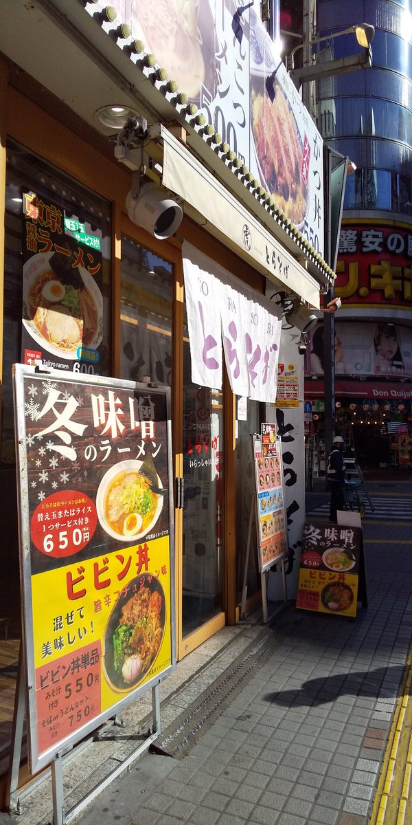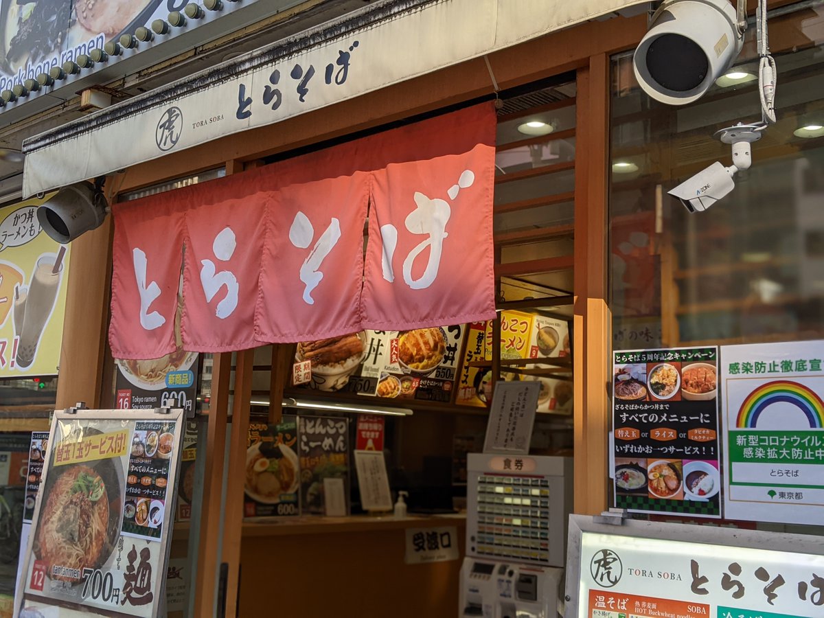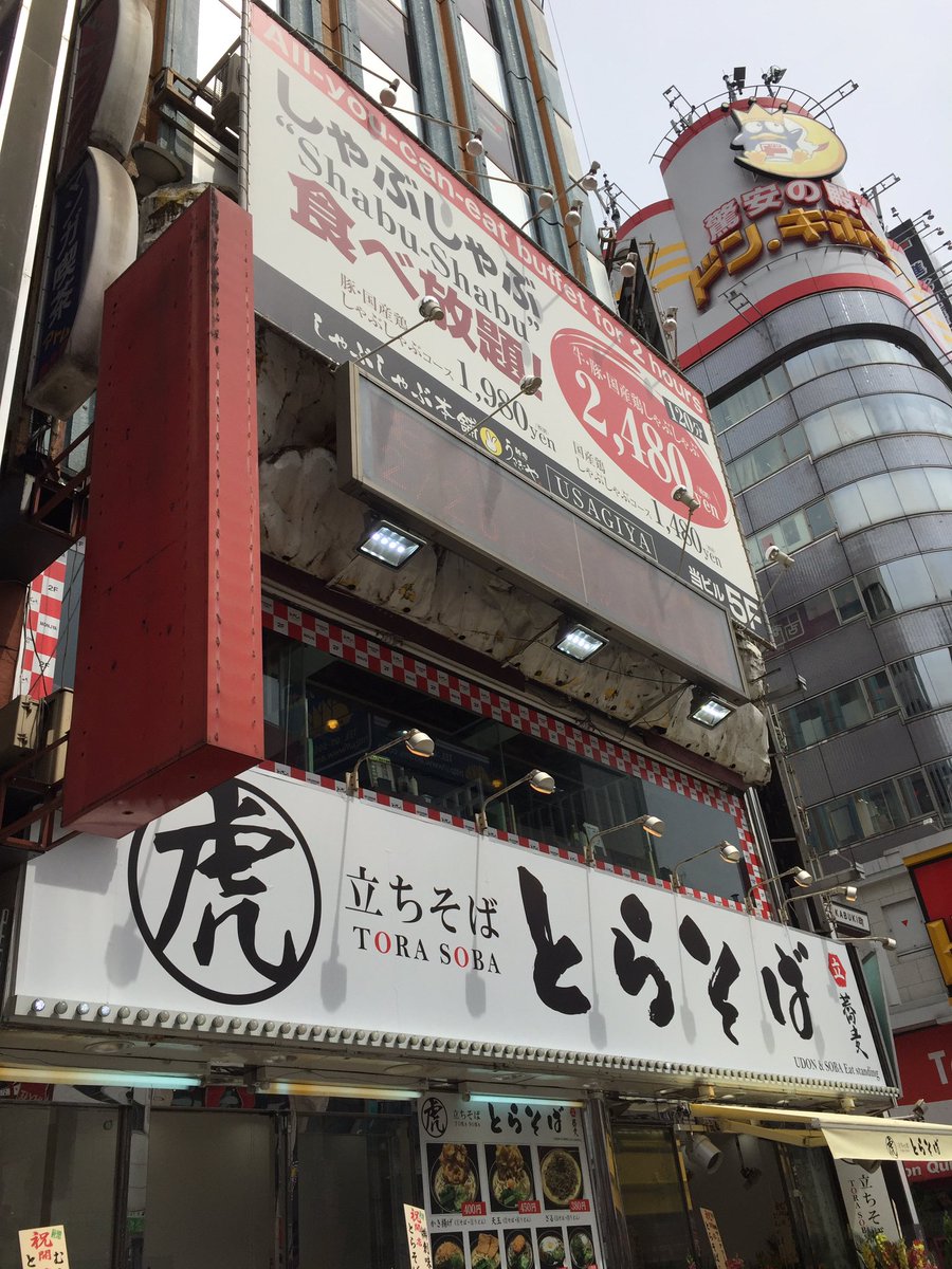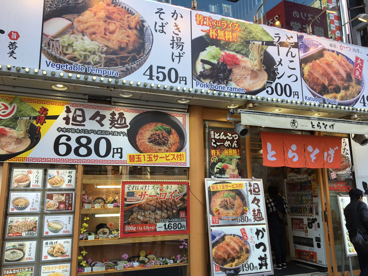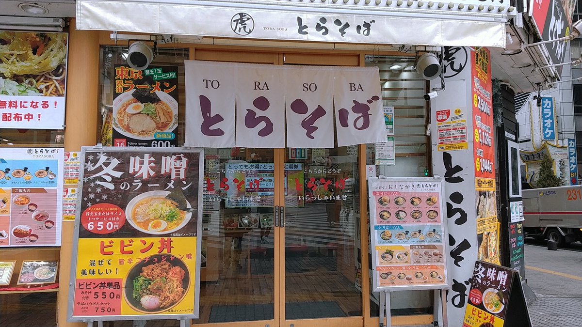 2016年11月14日14時25分。「歌舞伎町交差点」より、開店 7 か月後の「とらそば」を撮影しました。入口上に掲示されている「とらそば かけそば 280 円」などと書かれた店舗案内も写っています。