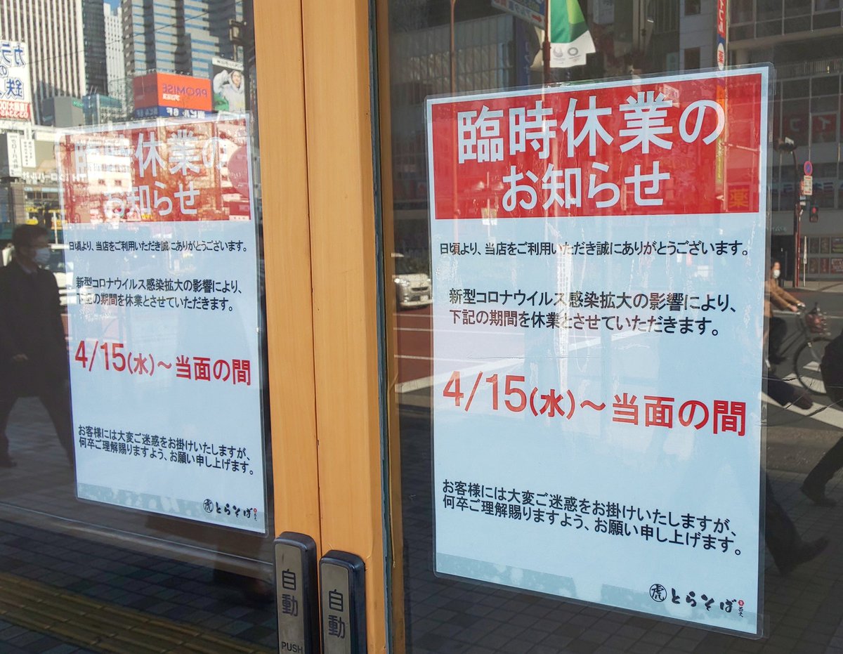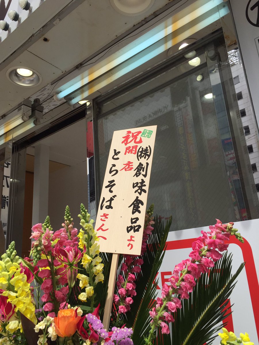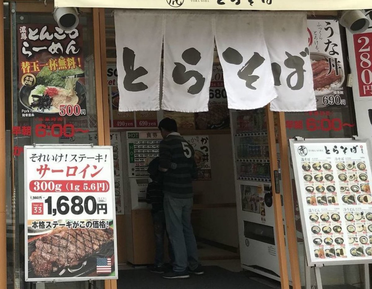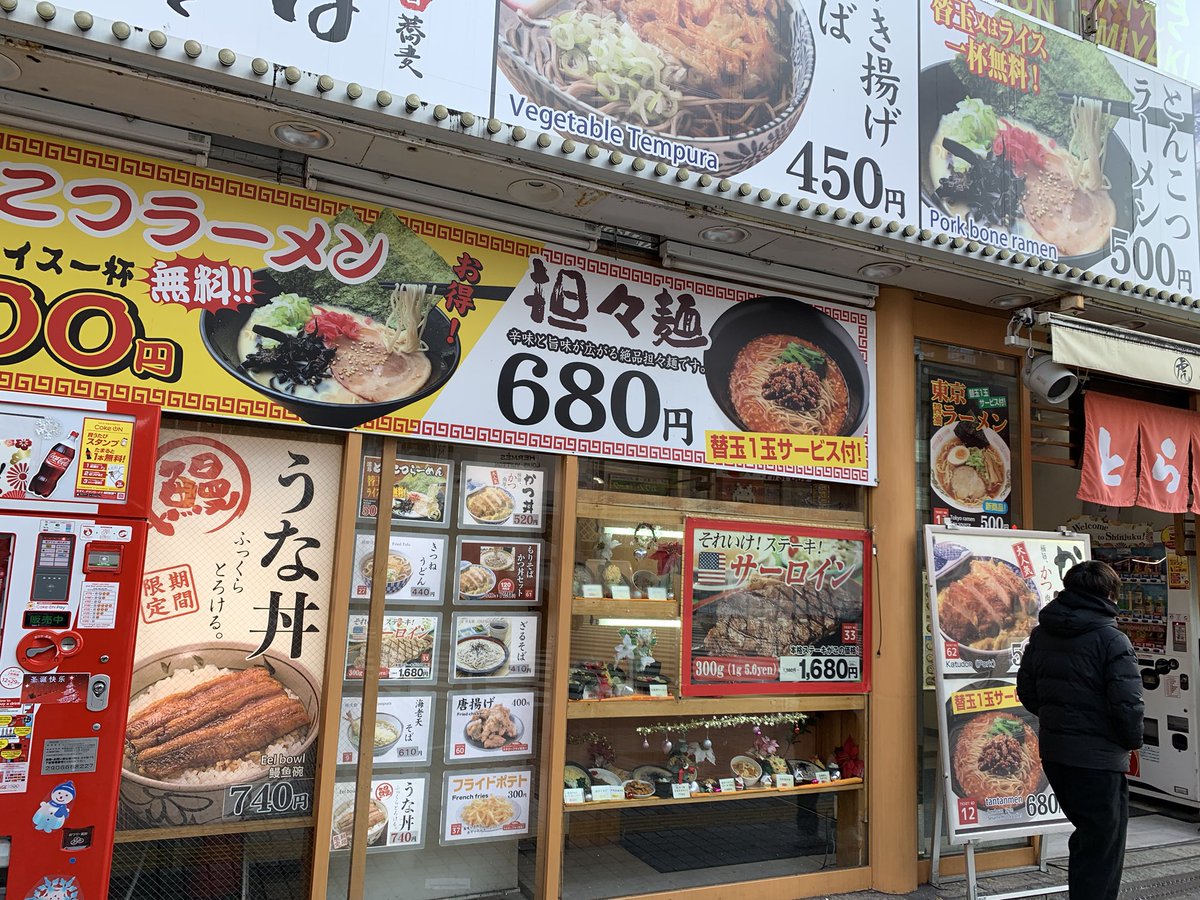 2016年11月14日14時25分。「歌舞伎町交差点」より、開店 7 か月後の「とらそば」を撮影しました。入口上に掲示されている「とらそば かけそば 280 円」などと書かれた店舗案内も写っています。