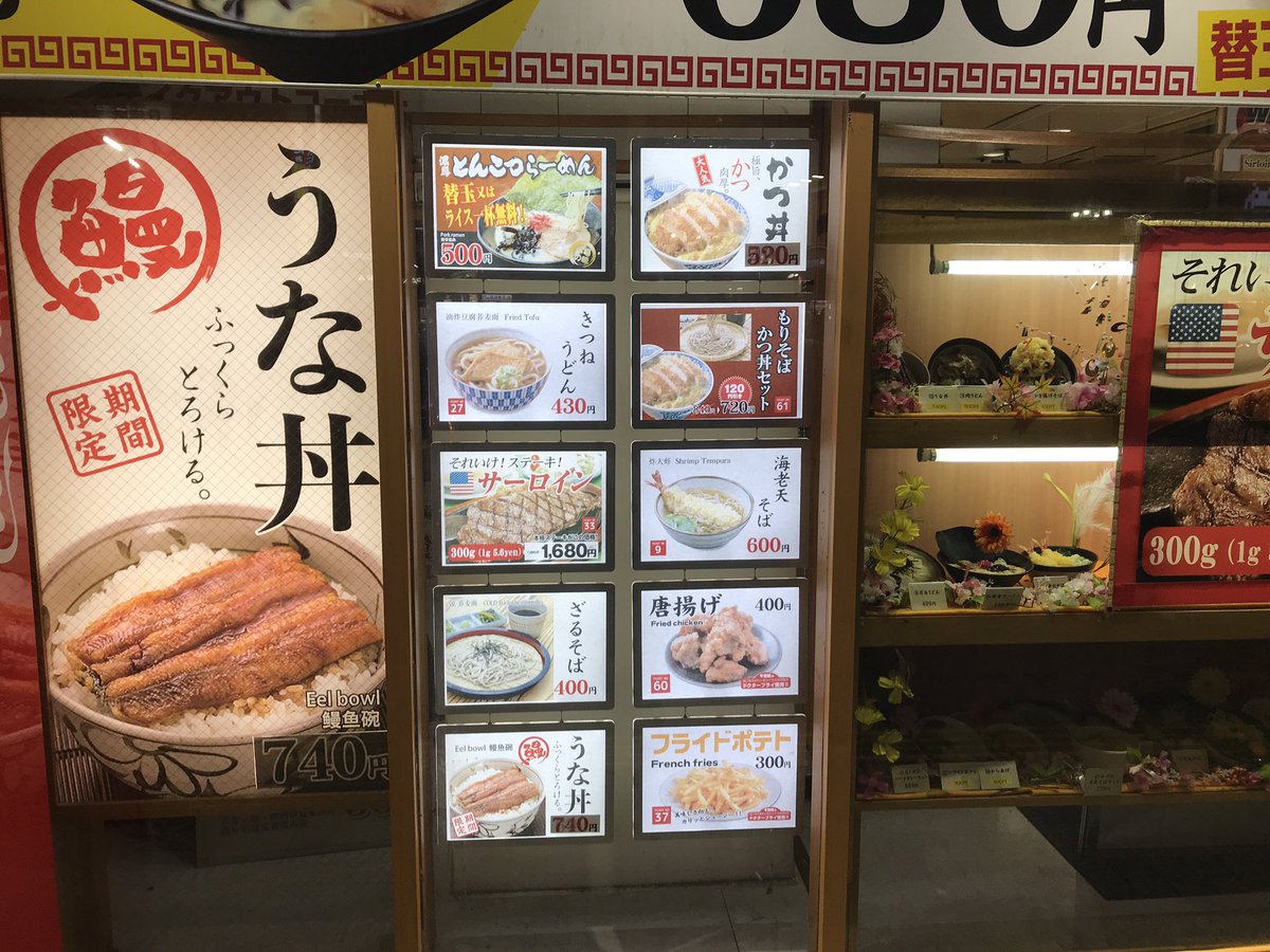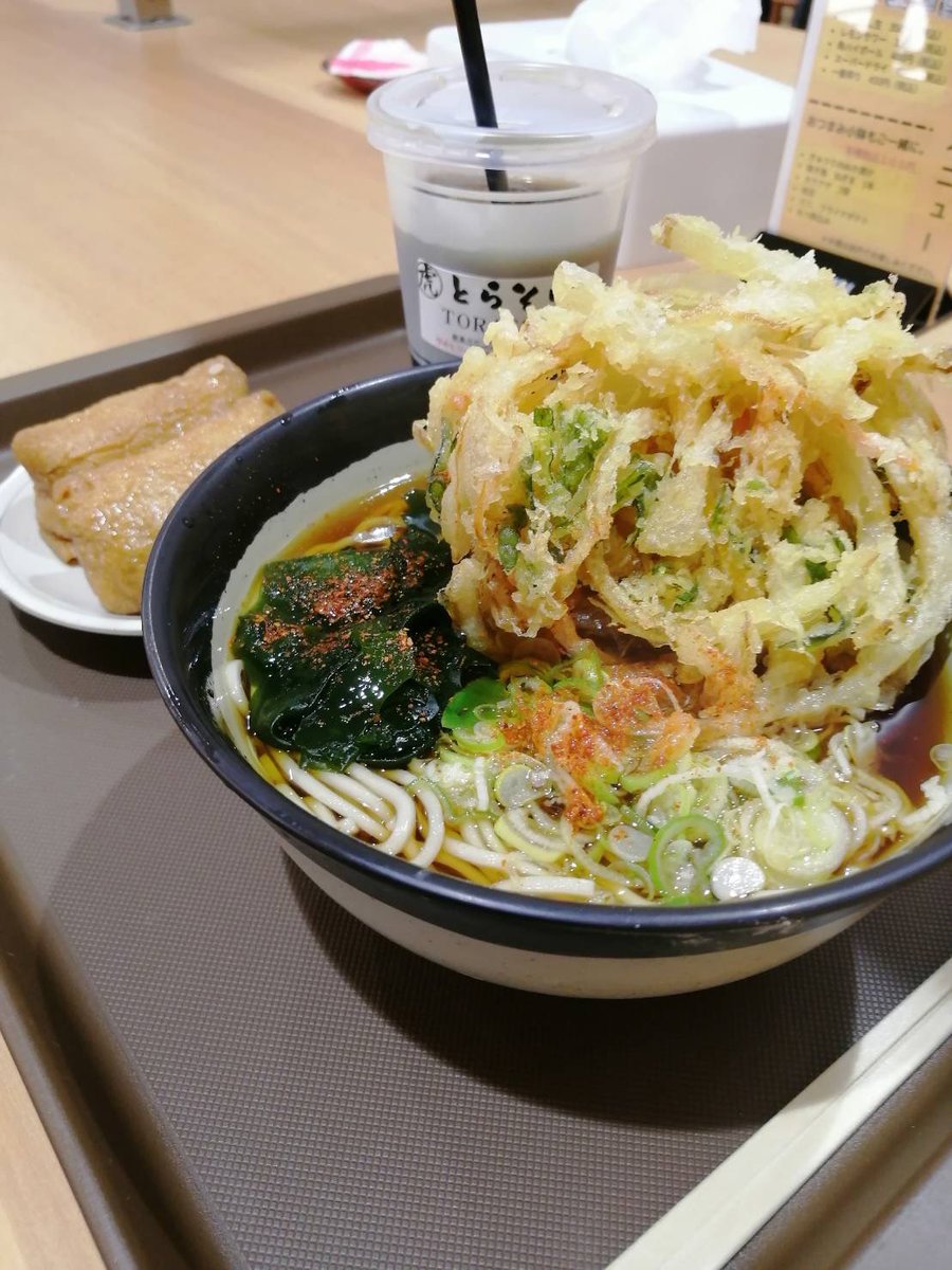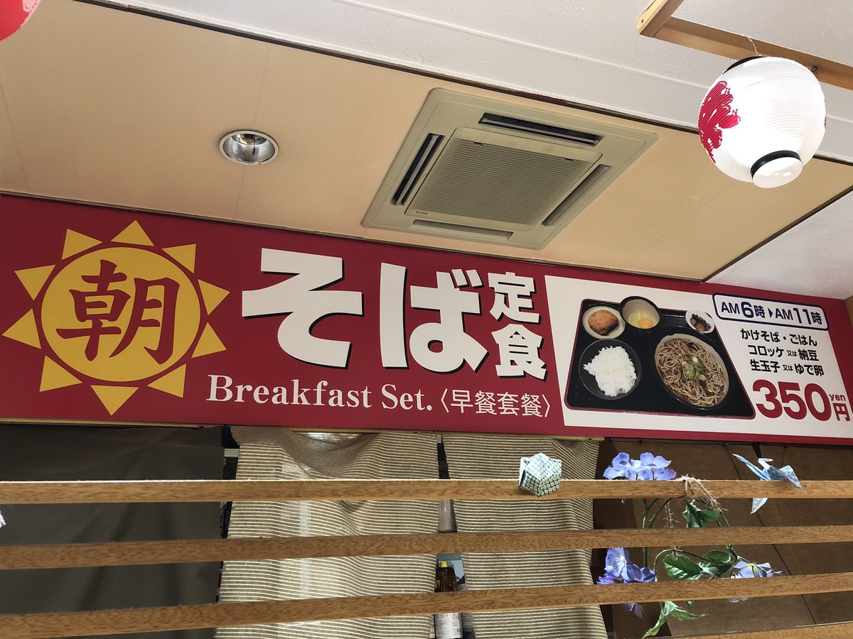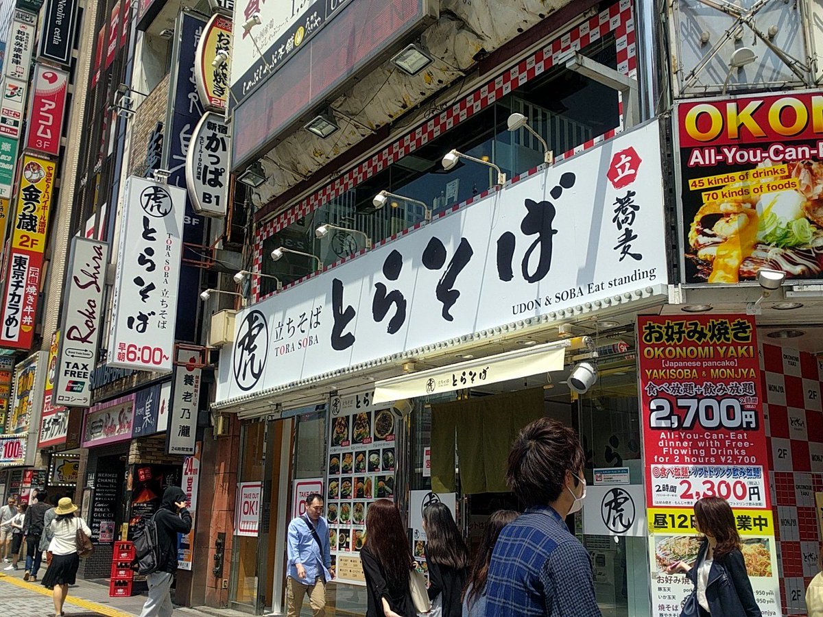 2018年7月3日16時17分。「歌舞伎町交差点」より「とらそば」を撮影しました。入口上に掲示されている「とらそば かけそば 280 円」などと書かれた店舗案内も写っています。 -