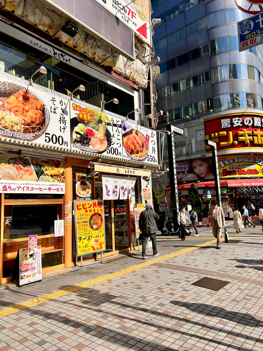 2017年10月11日13時55分。「歌舞伎町交差点」より「とらそば」を撮影しました。入口上に掲示されている「とらそば かけそば 280 円」などと書かれた店舗案内も写っています。 -
