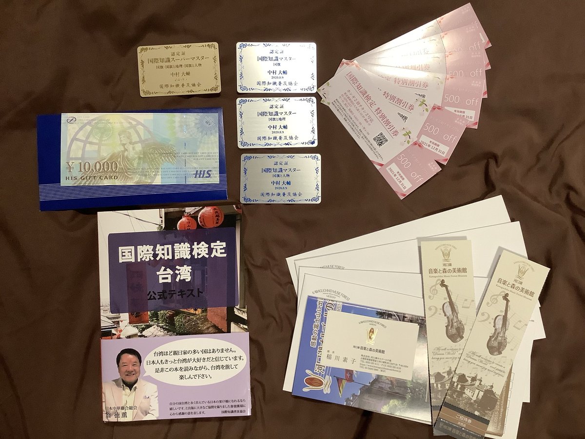台湾検定テキスト、音楽と森の美術館入場券(8枚)、ホシギ2羽チキン2号店割引券(3千円)、HIS旅行券(1万円)です。組み合わせが自由すぎませんか。