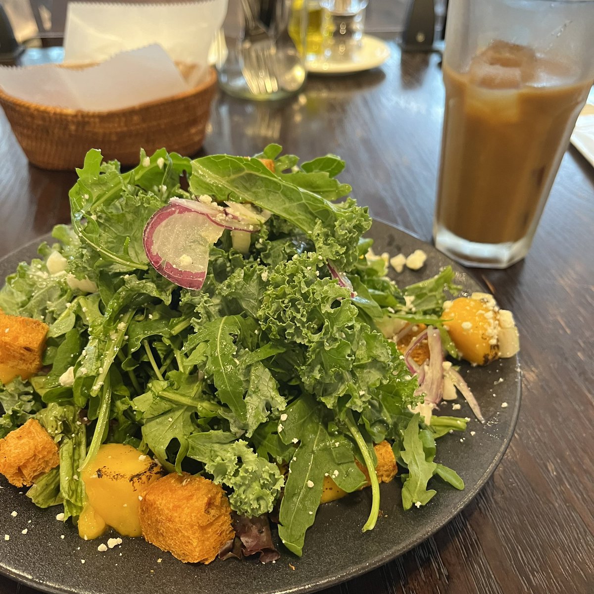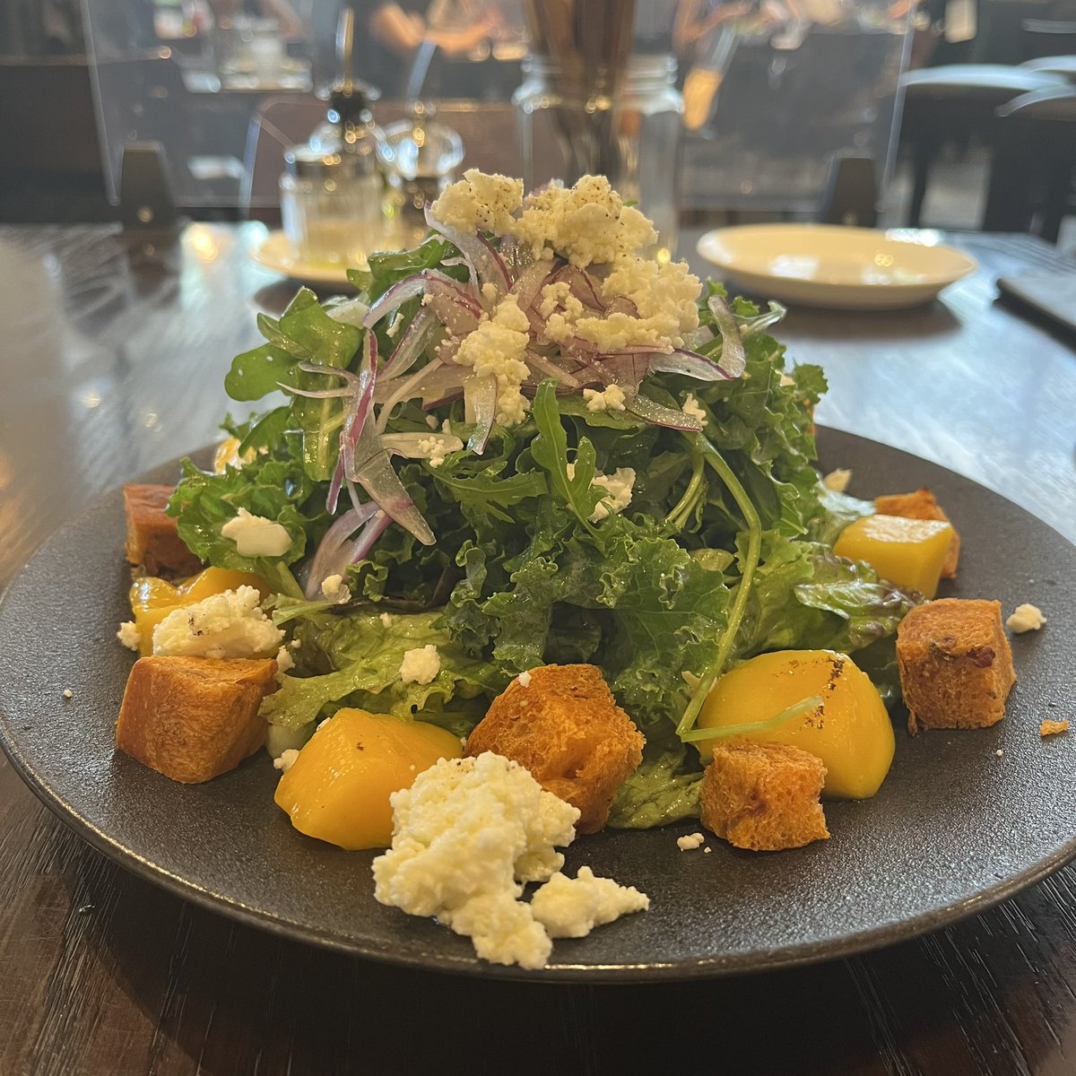 ケールが入ってるのかな?苦味がマンゴー、チーズとすごく合うんだよねえ。夏終わったらこのサラダ終わっちゃうのかな😢
