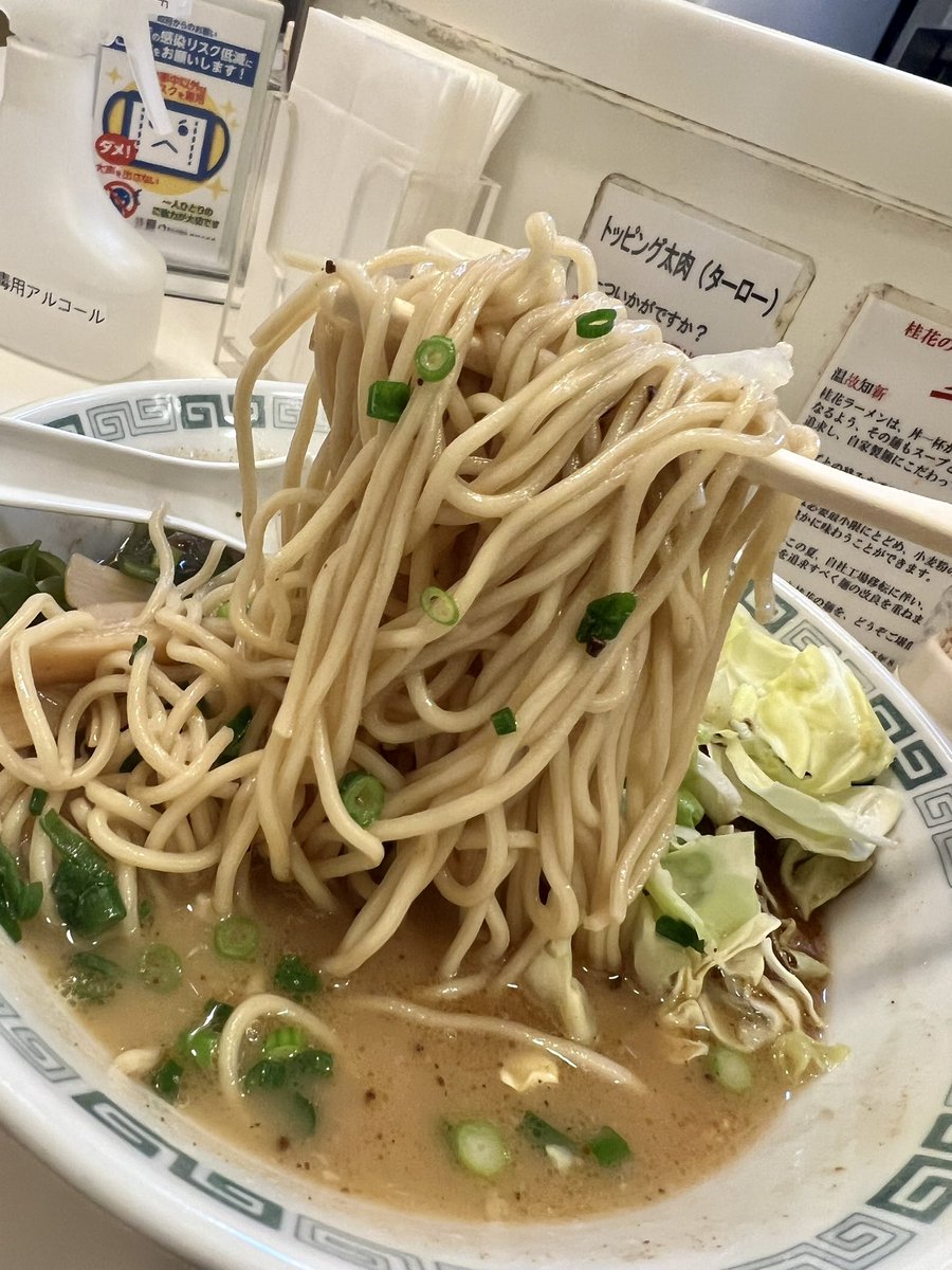 桂花ラーメン新宿東口駅前店。太肉麺固め。池袋東武店にいた店員さんに再会した。太肉定期券を教えてくれたり一本盛りを出してくれたり100回以上通ってすごくお世話になった。濃厚な豚骨と強めの塩気とポキポキの麺でめちゃくちゃうまい。この味を求めていたんだ。話もできてよかった。 pic.twitter.com/T1EKcX0YxB 2021-10-03 11:11:00