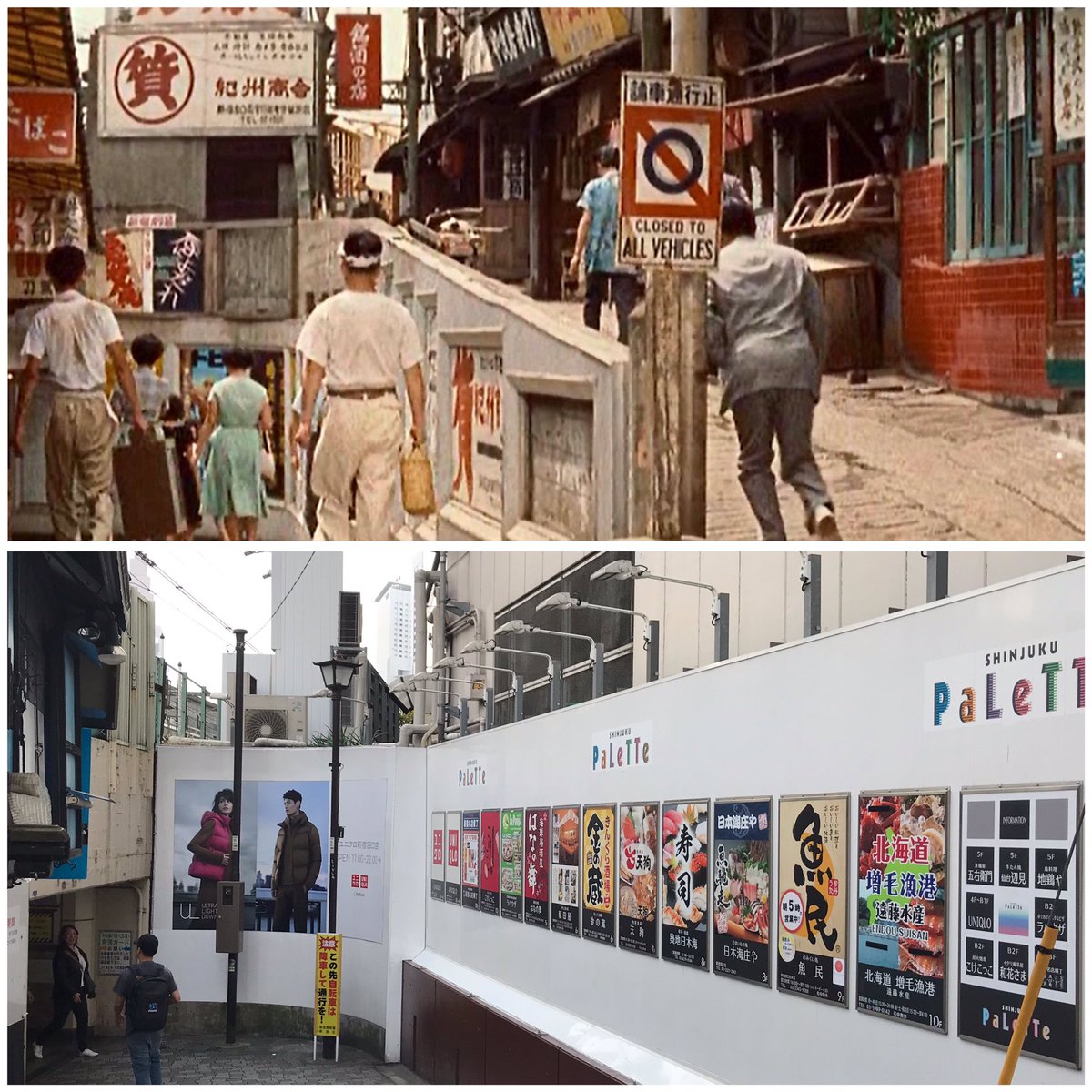 野村芳太郎監督『最後の切札』(昭和35年/松竹)から新宿西口七福小路(現・新宿パレットビル)の定点対比。左奥に西口と東口をむすぶ角筈地下通路。#旧景 #佐田啓二 pic.twitter.com/0DZGWIqOZo 2019-11-22 22:12:00