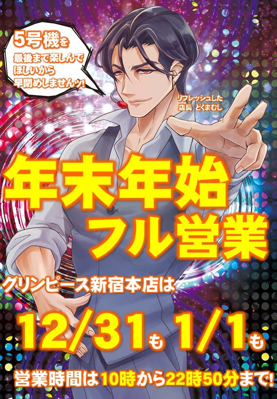 グリンピース新宿本店は、明日(大晦日)も明後日(元日)も、早締めなしでお届けします。