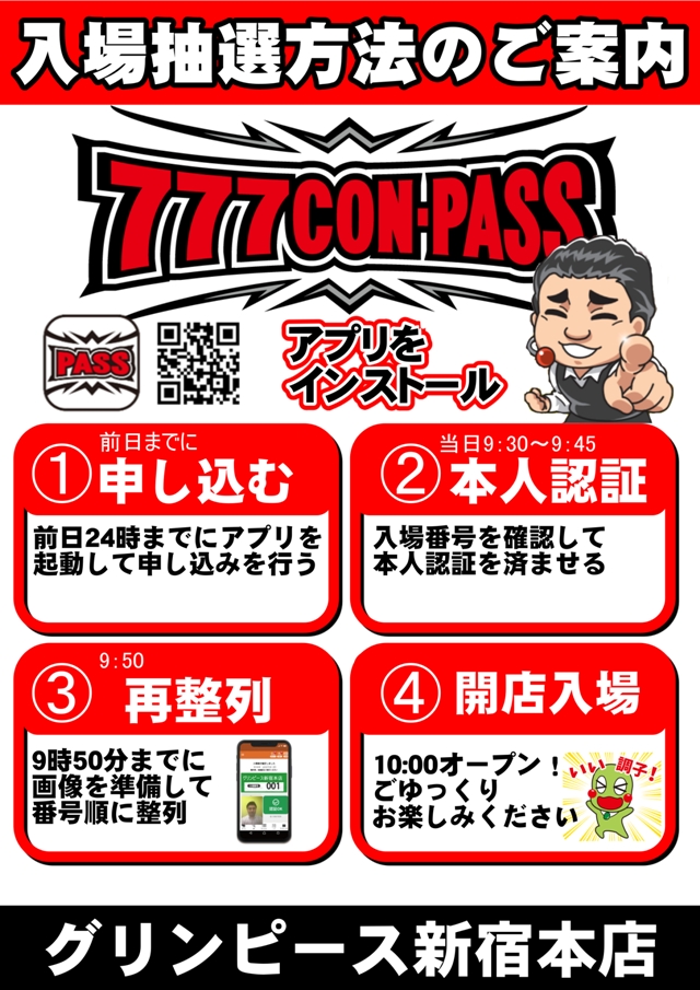 グリンピース新宿本店は777CON-PASで入場抽選を行なっております。