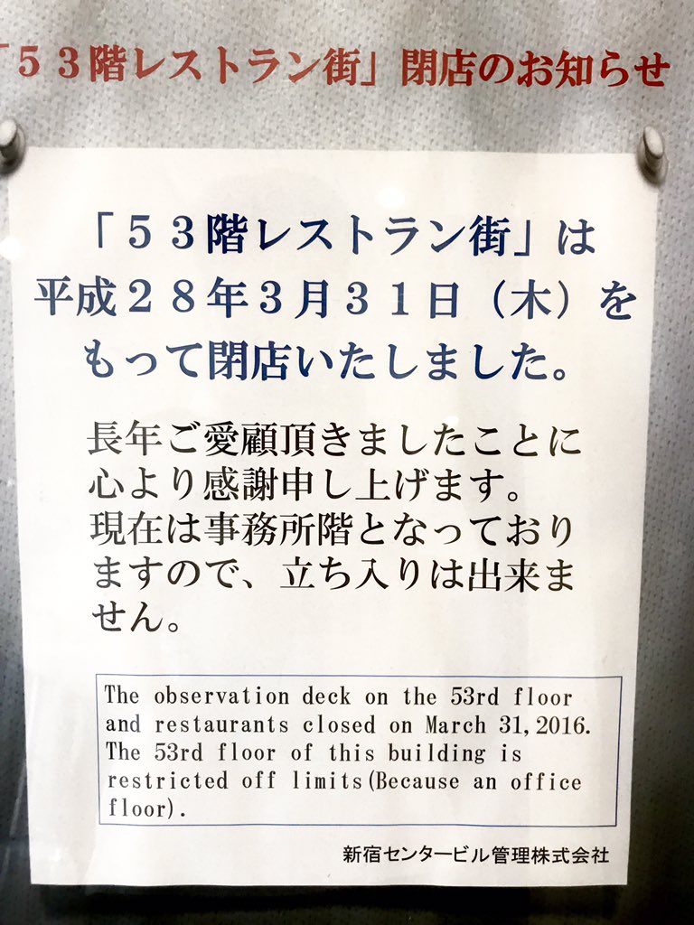 「53階レストラン街」 閉店のお知らせ